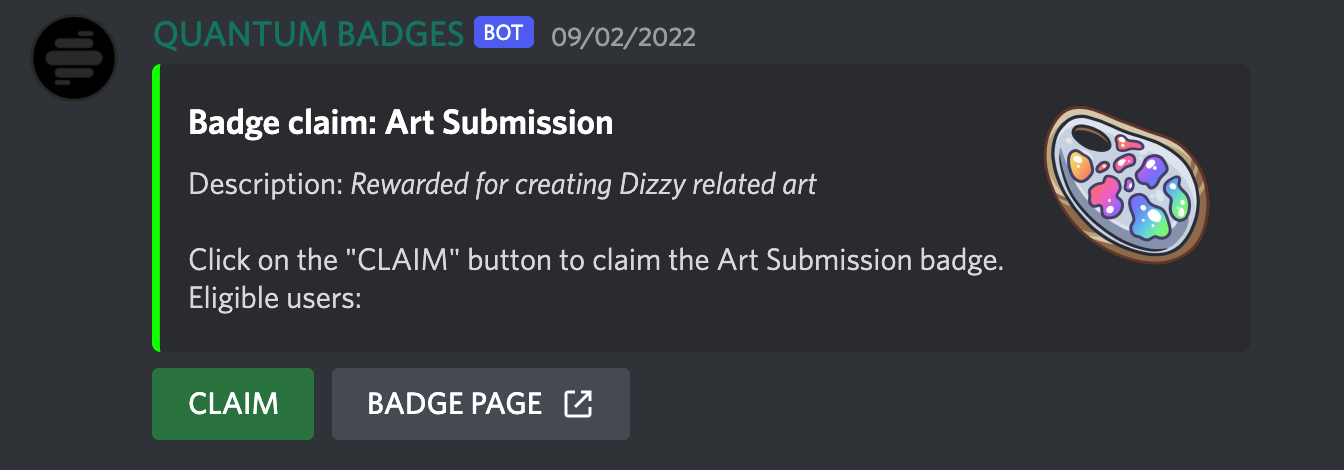 Example: If you create a piece of Dizzy related artwork and post it on social media - share that post in the Badge Submission channel and a Dizzy Art Badge claim will be created for you. *The same applies for all other badges that are live by following the requirements for each.